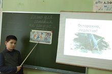 В начальных классах прошла беседа «Правила безопасного поведения на льду». Дети узнали причины несчастных случаев на воде; разобрал ситуации. Посмотрели мультфильмы»Азбука безопасности — На тонком льду», «Дядя Степа — милиционер». В конце провели блиц-опрос.