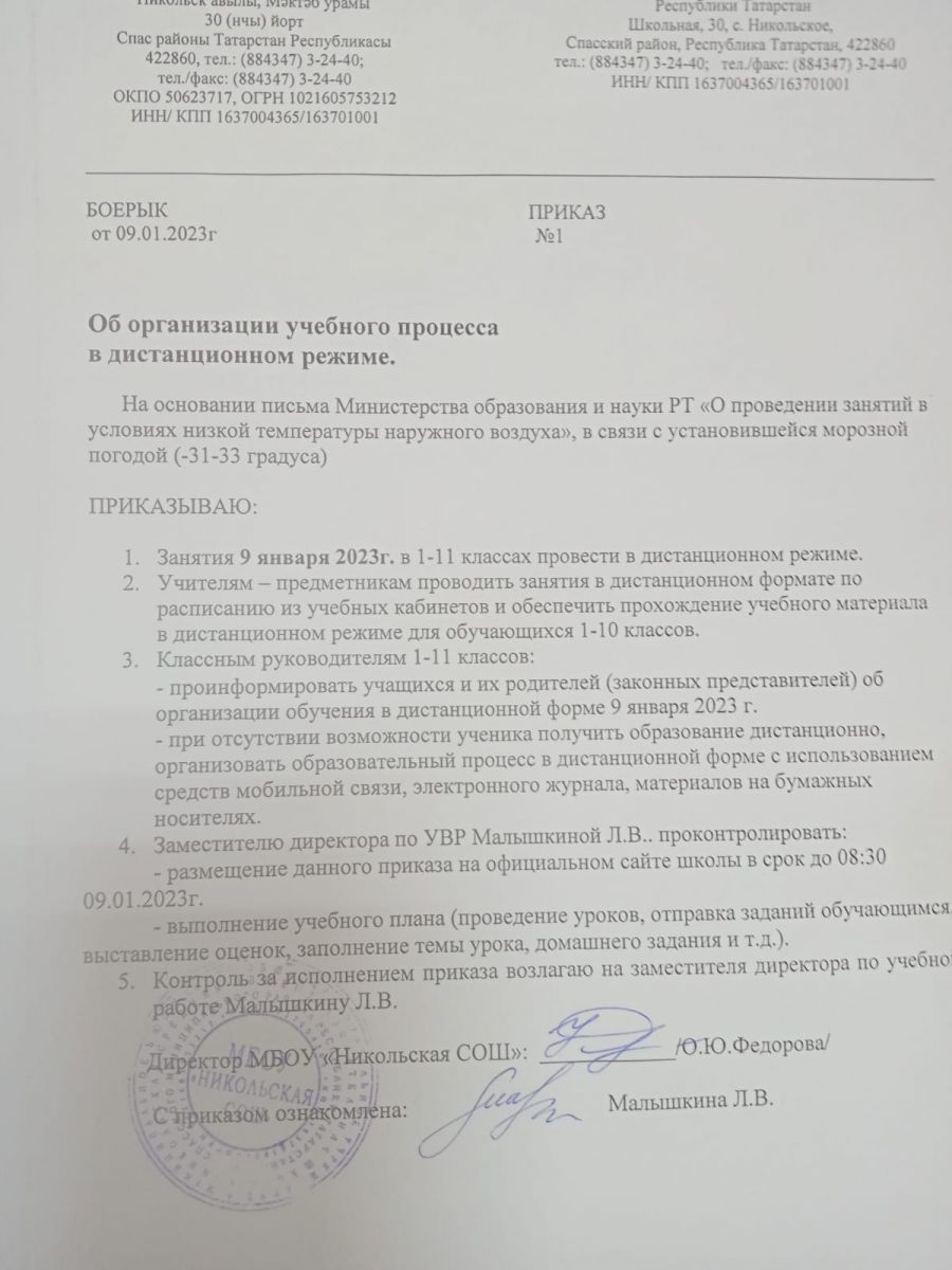 В связи с низкой температурой воздуха, занятия проводятся в дистанционном форме на основании Приказа №1 от 9.01.20223 по МБОУ "Никольская СОШ"