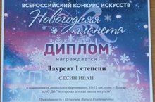 В декабре месяце учащиеися музыкального отделения класс преподавателя Пелагеиной Л.В приняли участие во Всероссийском конкурсе искусств "Новогодняя планета" и получили дипломы: