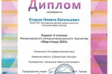 В январе месяце ученик музыкального отделения по классу баяна Егоров Никита (класс преподавателя Артюшиной Л.А.) участвовал в Международном конкурсе музыкального творчества "Жар-птица 2022", номинация "Инструментальный жанр" и получил диплом лауреата II степени.