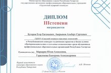 Буторов Егор и Аверьянов Альберт, студенты Спасского техникума отраслевых технологий, награждены дипломом 3 степени за участие в Республиканском конкурсе студенческих проектов и бизнес-планов "Предпринимательство в село- новые возможности" среди обучающихся профессиональных образовательных организаций Республики Татарстан . Руководители Маркарян Юлия Алексеевна , Герасимова Екатерина Александровна