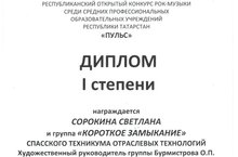 Студентка 3 курса Спасского техникума отраслевых технологий Сорокина Светлана заняла 1-е место в Республиканском конкурсе рок-музыки "Пульс". На конкурс был отправлен видеоклип на песню "А как же любовь" которую исполнила Светлана совместно с группой "Короткое замыкание" из Районного Дома культуры.