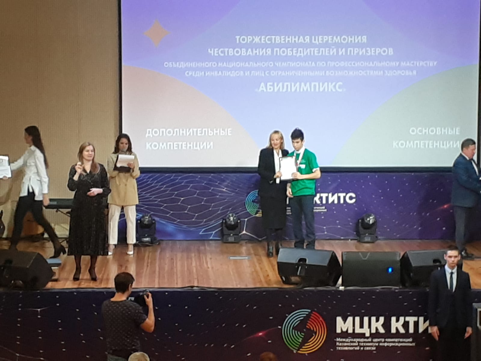 Опубликовано: 05.12.20222 декабря в международном центре компетенций г.Казань состоялось награждение победителей и призёров национального чемпионата по профессиональному мастерству среди инвалидов и лиц с ограниченными возможностями здоровья "Абилимпикс"- 2022. Команда из Татарстана заняла 2 место.Наши ребята Скрипаль Егор и Зеленко Константин стали бронзовым призерами по компетенции "Администрирование отеля" им заслуженно были вручены медали ,дипломы, и сертификаты. Со словами приветствия к присутствующим обратились и.о. министра образования Поминов А.И. и министр молодёжи РТ Сулейманов Т.Д. , потом состоялась прямая линия сборной команды с президентом Российской Федерации Путиным В.В