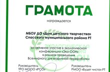 17 ноября 2018 года в г. Казань состоялась экологическая конференция «ЭКО-ООН» приуроченная к Всемирному дню вторичной переработки. Учащиеся МБОУ ДО «Дом детского творчества», активисты экологического движения «Будет чисто» приняли участие в данной конференции. Ребята достойно выступили с визиткой, защитили свой проект, за что были награждены грамотой и памятным подарком.