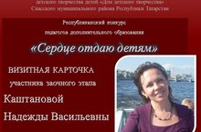 Педагог дополнительного образования Дома детского творчества Каштанова Надежда Васильевна заняла III место в Республиканском (заочном ) конкурсе педагогов дополнительного образования «Сердце отдаю детям» в номинации «Изобразительное и декоративно-прикладное творчество». На конкурс были отправлены программа и видеоролик об объединении «Город мастериц», в котором педагог ведет свою деятельность на базе Кузнечихинской СОШ.