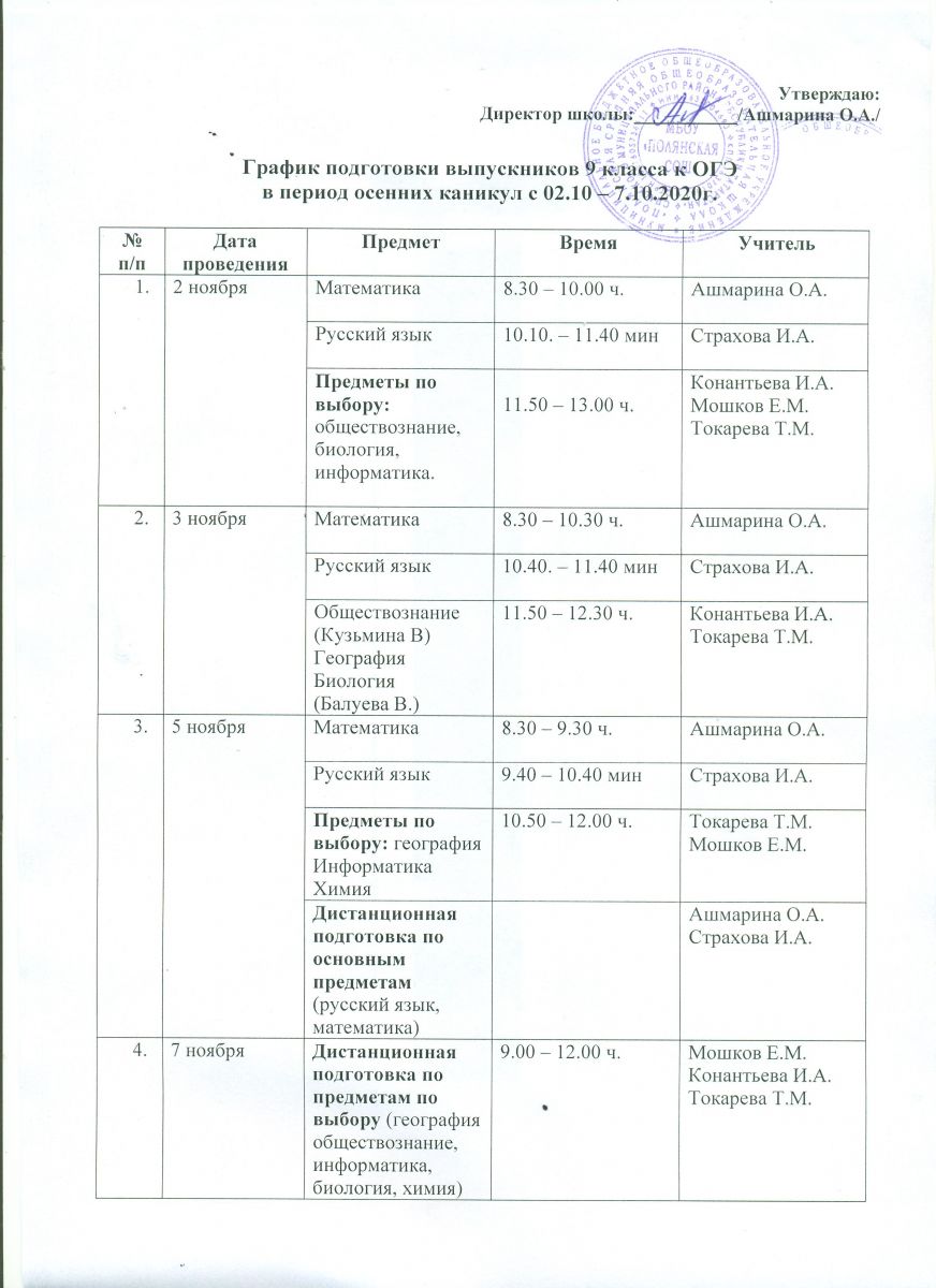 График консультаций по подготовке к экзаменам на осенние каникулы 01.11.2020