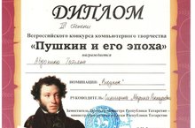 Всероссийский конкурс компьютерного творчества «Пушкин и его эпоха» проходит в рамках Всероссийского творческого конкурса «Пушкинские чтения». Организаторами выступают Министерство культуры Российской Федерации, музей – заповедник А.С. Пушкина «Михайловское», Министерство образования и науки Республики Татарстан, МАОУ «Лицей №78 имени А.С. Пушкина» г. Набережные челны. 28 марта 2018 года в «Лицей №78 имени А.С. Пушкина» г. Набережные челны прошел III Всероссийский и IX Республиканский конкурс. Ученица 7 класса МБОУ Никольская СОШ» представила на данный конкурс свою работу «Красуйся, град Петров…» в номинации «Рисунок». Конкурс проходил в два этапа: заочный и очный. На очном этапе, победители заочного этапа, представляли свои проекты. По итогам конкурса, за свой проект, Татьяна получила диплом III степени.