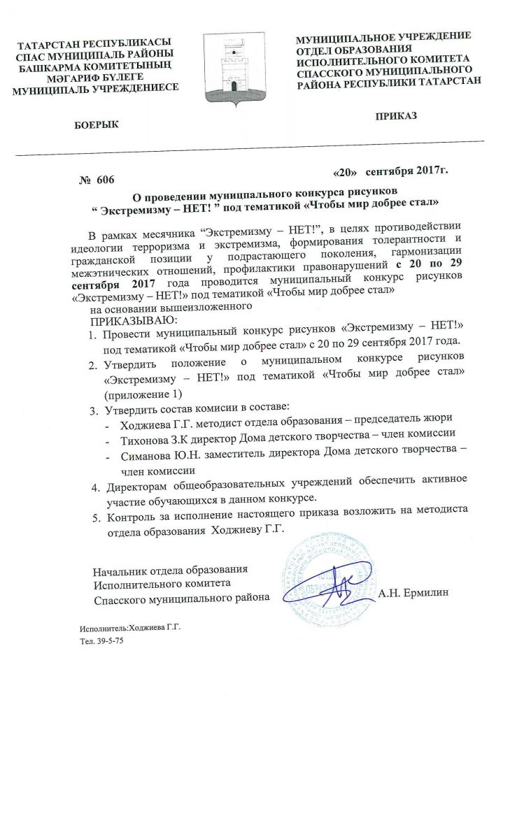 - Приказ об итогах проведения муниципального конкурса дестского рисунка Экстремизму Нет