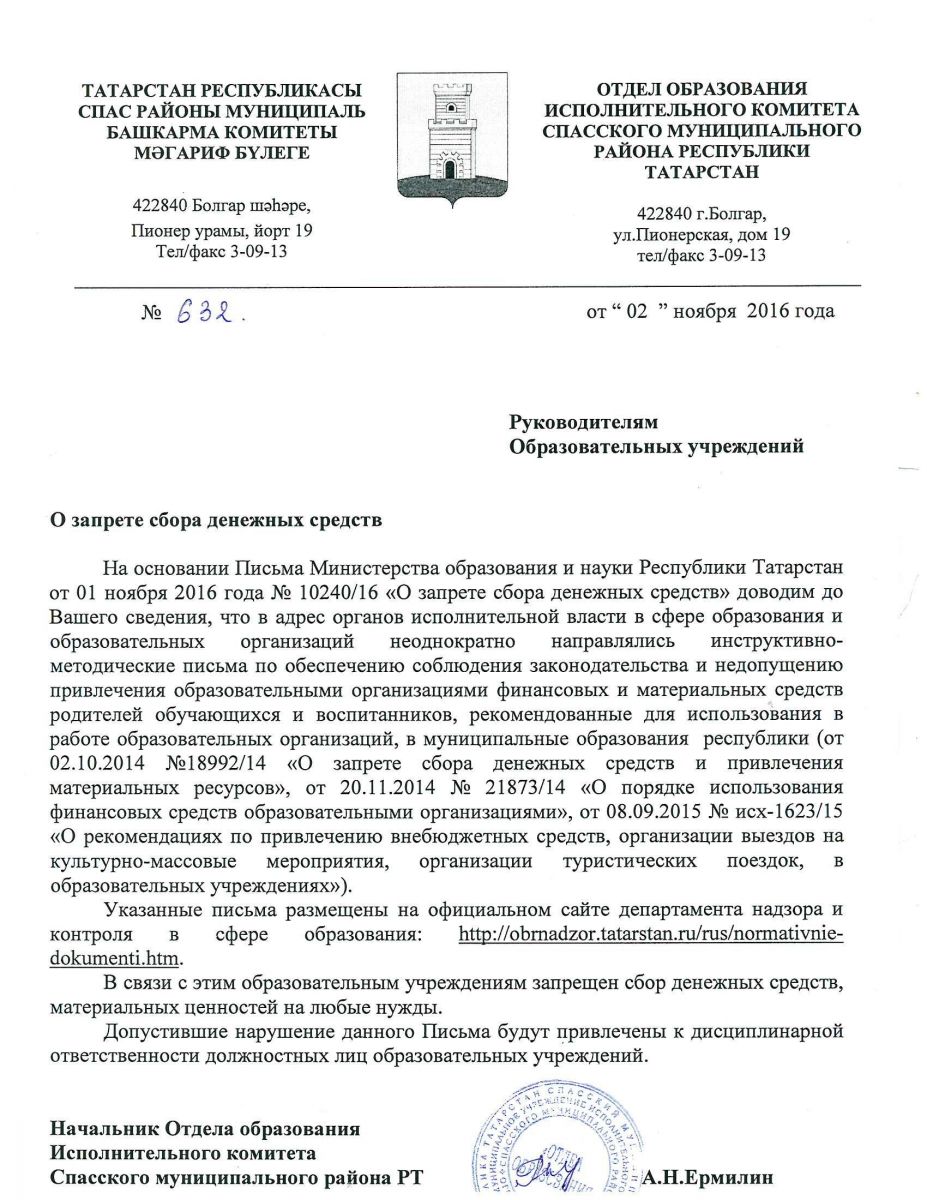 Письмо №632 от 02 ноября 2016 "О запрете сбора денежных средств"