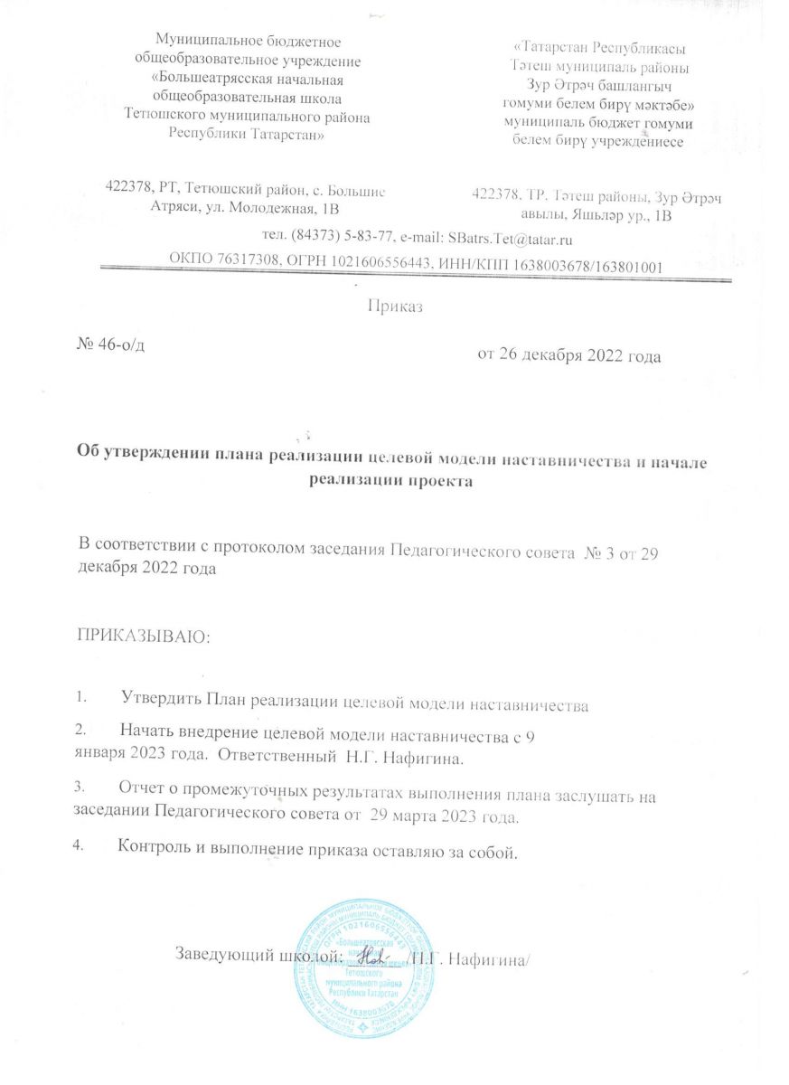 Приказ об утверждении Плана реализации целевой модели наставничества
