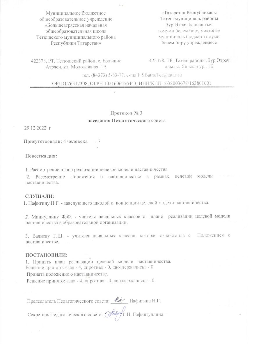 Муниципальное бюджетное общеобразовательное учреждение «Большеатрясская начальная общеобразовательная школа» Тетюшского муниципального района Республики Татарстан/Татарстан Республикасы Тәтеш муниципаль районы «Зур Әтрәч башлангыч гомуми белем бирү мәктәбе» муниципаль бюджет гомуми белем бирү учреждениесе