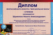 Дипломом Всероссийского конкурса "Моя школьная жизнь" 1 степени награжден ученик 4-го класса Шумилкин Никита. Руководитель Курмышкина И.Н. награждена благодарственным письмом за подготовку победителя.