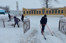 Учащиеся школы(члены движения "Юнармия", тимуровцы) очистили от снега территорию обелиска в центре села.