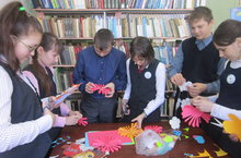 Неделя детской книги. День3 Лекарство от скуки. Девиз всего дня «Умеешь сам – расскажи, другому». Школьный библиотекарь провела мастер – класс изготовление декоративных цветов из бумаги. В дальнейшем цветы украсят библиотеку.