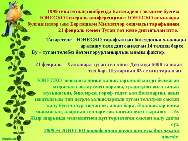 Международный день родного языка, провозглашенный Генеральной конференцией ЮНЕСКО в ноябре 1999 года, отмечается каждый год с февраля 2000 года для содействия языковому и культурному разнообразию и многоязычию. Этот праздник не только объединяет, но и сближает различные национальности. Каждый народ воспевает свой родной язык! И по этому случаю было проведено мероприятие совместно с учениками первого класса.