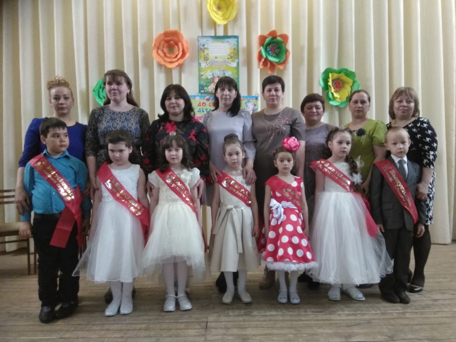 В связи с тем, что в нашем саду идёт капремонт выпускной провели 19 апреля в сельском доме культуры. Царила необыкновенная атмосфера. Девочки в воздушных платьицах, мальчики в строгих костюмчиках собрались в зале. Родители то и дело поправляли пышные наряды своим чадам и беспрерывно щелкали фотоаппаратами. И те, и другие заметно волновались: ведь это было очень важное для ребят событие – первый в жизни выпускной бал. С этим праздником детей поздравляли все сотрудники детского сада, родители, и приглашенные на праздник гости.