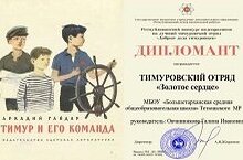 Тимуровский отряд "Золотое сердце" МБОУ "Большетарханская СОШ" стал дипломантом республиканского конкурса видеороликов на лучший тимуровский отряд "Добрые дела тимуровцев", посвящённого 85-летию повести А. Гайдара "Тимур и его команда" и 80-летию Победы советского народа в Великой Отечественной войне. Поздравляем тимуровский отряд "Золотое сердце" и их наставника Овчинникову Г. И. с этой заслуженной победой! Выражаем благодарность за вашу преданность и стремление делать мир лучше!