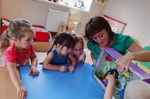 Подводный мир очень красочен и ярок! Сегодня в разновозрастной группе в гости пришёл медвежонок. И очень захотел посмотреть кто живёт в морях и океанах. Дети проявили желание помочь медвежонку. С радостью отправились в путешествие на подводной лодке. В ходе беседы узнали кто живёт на поверхности моря и его глубинах. В процессе продуктивной деятельности дети проявили активный познавательный интерес, наклеивали рыб и большого осьминога. Играли с водой в игру ,,Плыви, плыви, кораблик,,. День для детей получился насыщенным и интересным. -