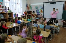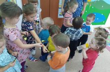 18 ноября во 2 ранней - 1 младшей группе прошло музыкальное развлечение «Озорные зверушки». Ребяткам предложили прогуляться по лесу, и в лесу они встретили белочку, которая захотела поиграть с шишечками. Потом ребятки встретили зайчика и станцевали танец «Веселых зайчат». По лесу проходила лисичка с корзинкой музыкальных погремушек, и предложила детям поиграть в погремушки. А последним в лесу встретился мишка и стал танцевать, все ребятки пошли за ним в веселый пляс. Ребятки были в восторге, что столько лесных зверей пришли к ним в гости, поблагодарили их за игры и веселые танцы.18 ноябрь көнне 2 иртә - 1 кечкенәләр төркемендә «Шаян җәнлекләр»дигән музыкаль күңел ачу чарасы узды. Балаларга урман буйлап йөрергә тәкъдим иттеләр һәм урманда алар күркәләр белән уйнарга теләгән аксымны каршы алдылар. Соңыннан балалар куянны каршы алдылар һәм «күңелле куян»биюен биеделәр. Урман буйлап Төлке белән бер кәрҗинле музыкаль төлке узды һәм балаларга шалтыравыклар уйнарга тәкъдим итте. Ә соңгысы урманда безгә аю очрады һәм бии башлады, барлык балалар да аның артыннан күңелле биюгә китте. Балалар үзләренә кунакка шулкадәр җәнлек килүләренә бик сөенделәр, уеннар һәм күңелле биюләр өчен рәхмәт белдерделәр.