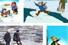Правила поведения на льду весной. Не выходите на лед во время весеннего паводка. Не катайтесь на самодельных плотах, досках, бревнах и плавающих льдинах. Не прыгайте с одной льдины на другую. Не стойте на обрывистых и подмытых берегах - они могут обвалиться. Если вы со взрослыми наблюдаете за ледоходом с моста, набережной причала то нельзя висеть на перилах и другие ограждения во избежание несчастного случая.