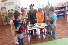 В рамках месячника оборонно - массовой, патриотической и спортивной работы, 14 февраля в средней группе была организована встреча с папой Ульяны Пановой - Андреем Владимировичем. Он рассказал детям о службе в военно – воздушных силах, ознакомил детей с распорядком дня солдата в армии, с учебой, физической подготовкой. Детей заинтересовал армейский альбом солдата, который он принёс с собой. Также Андрей Владимирович рассказал ребятам, как надо готовиться к армии. Детям было очень интересно, у всех появилось желание в будущем служить в армии.