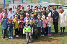Накануне великого Праздника-Дня Победы в детском саду «Сказка» с детьми подготовительной группы (воспитатель: Мусташкина Т.Б.) совместно с ГБОУ «Тетюшская кадетская школа-интернат имени генерал-майора Хапаева В.А.» прошла, ставшая уже традиционной, военно-патриотическая игра «Зарничка». С помощью игры мальчишки и девчонки получили возможность проявить себя, быть организованным коллективом, получили полезные навыки в принятии правильного решения. Зарничка-военно-спортивный праздник, который даёт детям бурю эмоций в реализации индивидуальных навыков по начальной военной подготовке, наглядное представление имитации боевых действий, совершенствование военно-патриотической и спортивной работы в детском саду. В ходе игры дошкольники совместно с кадетами разделились на команды и соревновались в различных эстафетах и заданиях, таких как: «В атаку», «Минное поле», «Лучший бой», «Снайперы», «Санитары», «Связисты», «Радисты».Пройдя все испытания, дети сложили девиз «Чтобы Родине служить, надо сильным, смелым быть!» из слов, собранных во время всей игры. Кадеты показали дошкольникам технику рукопашного боя, навыки сборки-разборки макета автомата. Закончилось военно-патриотическая игра посещением музея кадетской школы. Коллектив детского сада «Сказка» выражает благодарность администрации и учащимся кадетской школы за проявленный интерес к данному мероприятию и поддержание и укрепление преемственности поколений.