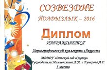 Хореографический коллектив "Акцент" нашего детского сада (руководители Минневалиева Л.И. И Гумерова Л.Р.) занял 1 место в XVI районном молодежном фестивале эстрадного искусства "Созвездие" "Йолдызлык -2016" в номинации "Хореография", младшая группа. Желаем юным звездочкам новых успехов и достижений!