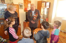 20 февраля накануне праздника День защитника Отечества дети логопедической группы МБДОУ «Детский сад комбинированного вида «Сказка» города поздравили участника Великой Отечественной войны Авдонина Ивана Николаевича с приближающимся праздником. Вручили ветерану открытку, изготовленную своими руками и вкусный, ароматный пирог. Иван Николаевич тепло встретил детей и поблагодарил за подарок, сделанный от всего сердца. Он рассказал о тяжелом военном времени. Ребята с большим интересом изучали медали ветерана и, увлеченно слушали рассказ о его воинской судьбе.