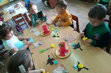 Ребята средней группы беседовали о зимующих птицах и рисовали синичку на бумаге с помощью пластилина