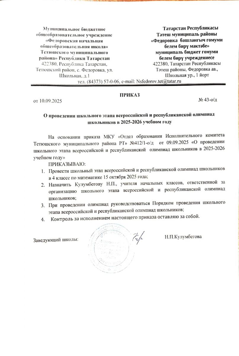 Приказ по школе о проведении школьного этапа всероссийской и республиканской олимпиад школьников