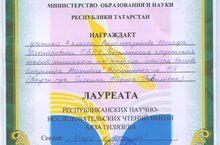 В селе Сарманово прошли Республиканские научно-исследовательские чтения, посвященные 90-летию татарского народного писателя и драматурга Аяза Гилязова. В номинации “Проза А.Гилязова” принял участие воспитанник 7 класса Низамутдинов Инсаф. Эти чтения стали для Инсафа первым конкурсом республиканского уровня. Наш воспитанник стал Лауреатом конкурса и был награжден Дипломом Министерства образования и науки РТ (руководитель – учитель татарского языка и литературы Сиякина Н.Р.).