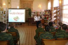 25 апреля воспитанники 5 и 6 классов ГБОУ «Тетюшская кадетская школа-интернат имени Хапаева В.А.» в рамках Весенней недели добра посетили Детскую библиотеку. После знакомства кадетов с многообразием книжного фонда и периодических изданий библиотеки, для них был проведен час доброты «Твори добро на благо людям». В ходе мероприятия ребята размышляли, что такое доброта, какого человека можно назвать добрым, какие поступки его украшают, приводили примеры своих добрых дел по отношению к своим близким, к окружающим людям, вспоминали пословицы и поговорки о добре. Хорошее настроение создавали видеоролики и песни о доброте.