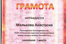 Воспитанницу 7 класса Малькову А. – победителя муниципального этапа Республиканского этапа Всероссийского конкурса детско-юношеского творчества по пожарной безопасности «НЕОПАЛИМАЯ КУПИНА»; номинация «технические виды творчества» (руководитель Хуснутдинова Н.В.).