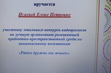 Воспитатель Исаева Елена Петровна получила благодарственное письмо за участие в зональном конкурсе видеороликов на лучшую организацию развивающей предметно – пространственной среды по национальному воспитанию «Рядом дружно мы живем».