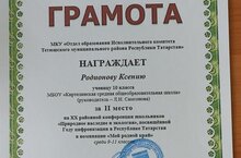 Поздравляем учащуюся 10 класса Родионову Ксению с результативным участием в XX районной конференции школьников "Природное наследие и экология", посвященной Году цифровизации в Республике Татарстан. По итогам конкурса Ксения заняла II место в номинации "Мой родной край". Руководитель: Самсонова Л.Н.