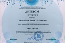 Дипломом I степени награждена Самсонова Лидия Николаевна, классный руководитель 10 класса, ставшая победителем муниципального этапа Всероссийского дистанционного конкурса среди классных руководителей на лучшие методические разработки воспитательных мероприятий. Поздравляем!
