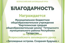 В рамках проведения в 2017 г. Года особо охраняемых природных территорий в январе текущего года стартовал проект «Всероссийский заповедный урок» , который реализуется по инициативе ЭкоЦентра «Заповедники» в рамках Программы «Движение друзей заповедных островов» при поддержке Комитета общественных связей г. Москвы, ГПБУ «Мосприрода», АНО «Твоя природа», а также при информационной поддержке Минприроды России и Минобрнауки России. Идею реализации Урока также поддержали Российское движение школьников, Русское географическое общество, Зеленое движение России «ЭКА», Ассоциация «Экосистема» и ООД «Исследователь». Активное участие в данном проекте принимает Татарстан, который по итогам января т.г. является лидером по количеству участников проекта. Для участия в этом проекте в нашей школе проведен "Всероссийский заповедный урок" в 1-4 классах, 5-7 классах и 9-11 классах.