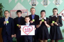 В рамках весенней недели добра учащиеся 7 класса в "День добрых начинаний" раздали учащимся и работникам школы эмблемы с призывом "Дари добро".