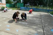 Девятый день смены пришкольного лагеря труда и отдыха «РИТМ» - «Экватор – середина смены». С самого утра девочки из отряда провели зарядку и флеш-моб «Спорт против наркотиков» с детьми, посещающими пришкольный оздоровительный лагерь «Солнышко». Славно потрудились на пришкольном участке, убрали территорию памятника, очистили от травы территорию вокруг школы. Также в этот день подвели итоги работы отряда за прошедший период, каждый высказал свое мнение по работе лагеря. Итогом стал конкурс рисунков на асфальте «Пусть всегда будет солнце, пусть всегда будет мир!».