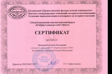 Учащаяся 8 класса Казаева Евгения приняла участие в I Республиканском лингвистическом форуме "Bridging Languages and Cultures", который проходил в г.Казань в Институте международных отношений, истории и востоковедения (руководитель: учитель английского языка Макарова Е.Н.)