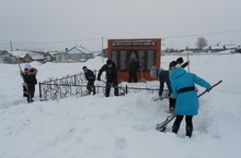 Учащиеся 7 класса с учителем ОБЖ Абраконовым С.С. убрали снег вокруг Памятника павшим в Великой Отечественной войне.