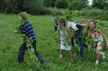 19 июня в пришкольном лагере прошел день русских традиций. Ребята с удовольствием поучаствовали в праздновании Святой Троицы, плели венки и пускали их в озеро.