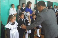 Сегодня в нашей школе была проведена линейка, посвящённая Дню знаний. Первый раз прозвенел звонок для шести первоклассников. На празднике присутствовали гости. Заместитель руководителя исполнительного комитета А.А. Гасимов вручил первоклассникам памятные подарки - звоночки. Затем классные руководители провели уроки мира.