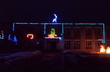 Сегодня завершили оформление фасада здания школы, украсив дюралайтом и гирляндами. Возле школы стоят Дед мороз и Снегурочка, а на крыше гордо стоит Олень.