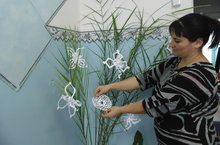 Сегодня в школе с утра прошел мастер-класс "Ажурная снежинка". Выполненные работы повесили на "пальму-елочку".