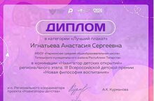 По итогам регионального этапа III Всероссийской детской премии «Новая философия воспитания» советник директора по воспитанию Игнатьева А. С. награждена дипломом "За лучший плакат" в номинации "Навигатор детских открытий".