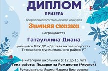 С 01 по 10 января 2021г. учащиеся Детской школы искусств художественного отделения под руководством преподавателя Яшиной М.В. приняли участие во Всероссийском творческом конкурсе «Зимняя сказка». Цель конкурса: реализация творческих способностей детей школьного возраста, интереса к художественным видам творчества и выявление талантливых детей. Конкурсы проводились по соответствующим возрастным группам. В результате, по итогам конкурса, в номинации "Рисунок" учащиеся Детской школы искусств Юсупова Зарина и Гатауллина Диана (3 класс ДШИ) награждены Дипломами Победителя и Призера. Учащиеся представили на конкурс творческие работы по теме: «Замок Снежной Королевы» и «Подарки на Рождество». Поздравляем!