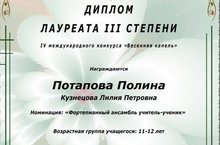 В марте 2019 года учащиеся Детской школы искусств под руководством преподавателя музыки Кузнецовой Л.П. приняли участие в Международных конкурсах исполнительского искусства. По итогам Международного конкурса «Голос флейты», организованного международным информационно - образовательным центром (г.Москва), дипломом Лауреата I степени в номинации «Инструментальный жанр» удостоена учащаяся 5 класса Бехтина Дарья. Дипломом Лауреата I степени в номинации «Инструментальный жанр» Международного конкурса музыкального творчества «Моя мелодия…» отмечена Богян Маргарита, учащаяся 6 класса, дипломом Лауреата II степени в номинации «Инструментальный жанр» отмечена Потапова Полина, учащаяся 5 класса.