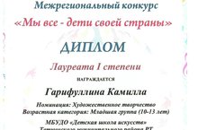 В декабре учащиеся художественного отделения Детской школы искусств приняли участие в Межрегиональном конкурсе «Мы все – дети своей страны». Конкурс проводился на базе МБУ ДО «Детская музыкально-хоровая школа №3» Ново-Савиновского района г.Казани.