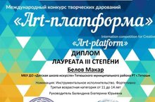 Завершился VI Международный конкурс творческих дарований «ART-PLATFORM», организованный Art-association «Зажечь звезду» (г.Казань) при поддержке ГБУДО «Республиканский центр внешкольной работы» РТ. В состав жюри конкурса вошли деятели культуры и искусства Республики Татарстана и Российской Федерации, ведущие специалисты разных жанров художественного творчества, педагоги творческих образовательных учреждений. В номинации «Инструментальное исполнительство» приняли участие более 300 человек. Оценивалась техника и уровень исполнительского мастерства, артистизм исполнителей, оригинальность мышления, соответствие выбранному направлению. От Детской школы искусств приняли участие: учащийся 6 класса музыкального отделения Белов Макар и фортепианный дуэт преподавателей Баландиной Екатерины и Головой Владлены. По итогам конкурса в номинации «Инструментальное исполнительство. Фортепианный ансамбль» в третьей возрастной категории (11 – 14 лет) Макар стал Лауреатом III степени, фортепианный дуэт преподавателей Баландиной Екатерины и Головой Владлены стал Лауреатом II степени. Преподаватели отмечены Благодарственными письмами оргкомитета за высокий профессионализм и творческий подход. Поздравляем!